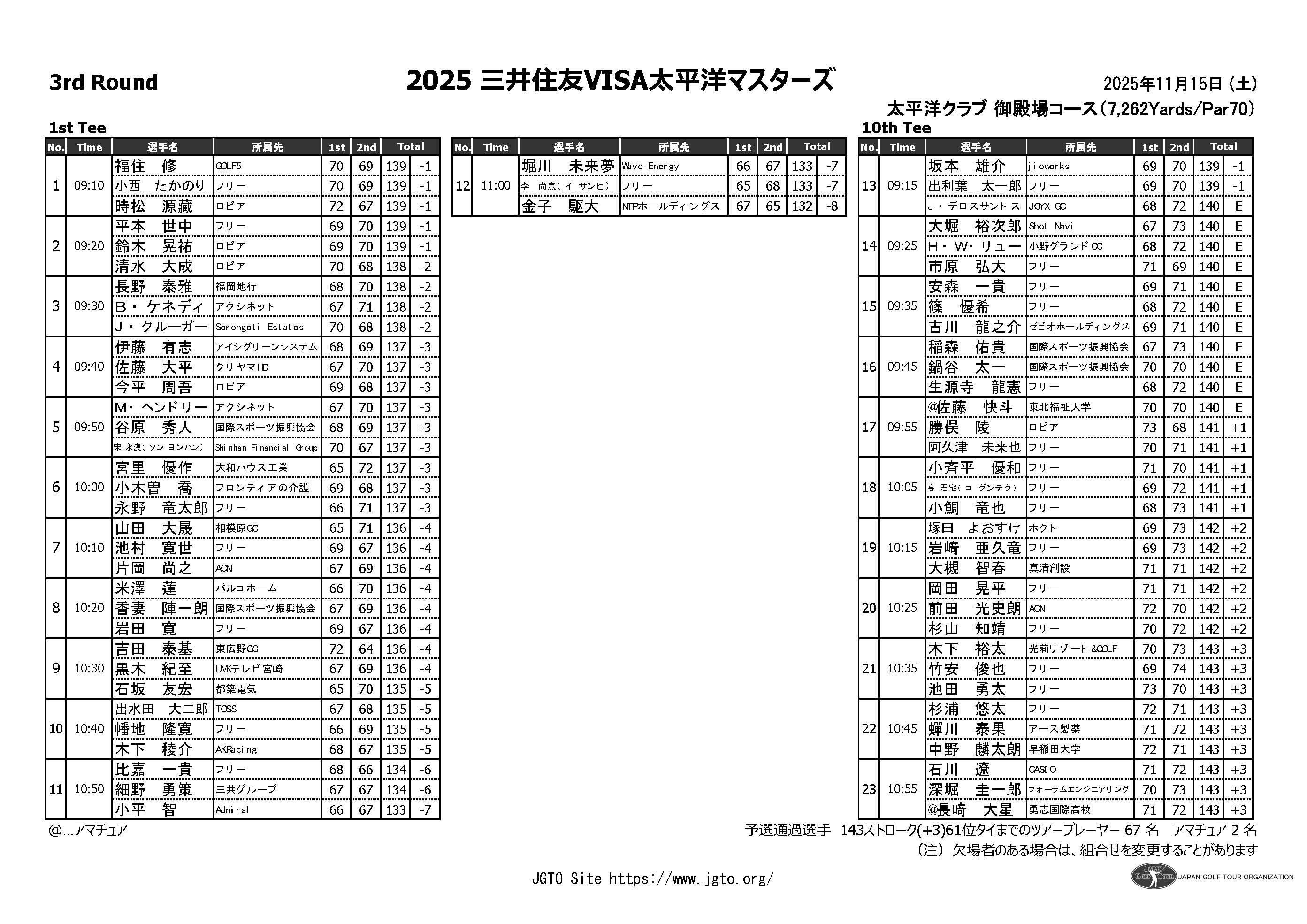 【第3ラウンド】ペアリング決定!2025年11月13日お知らせ第3ラウンドのペアリングが決定!本日の結果をもって予選通過選手が決定しました。61位タイまでのツアープレーヤー 67 名、アマチュア 2 名が明日からの決勝ラウンドに出場します。トップスタートは9:10、最終組スタートは11:00となります。詳細はこちらをご確認ください。https://www.jgto.org/tournament/2964/teetimeShareXFacabookLINEお知らせ一覧へ< 前の記事へ次の記事へ >HOMEお知らせ【第3ラウンド】ペアリング決定!